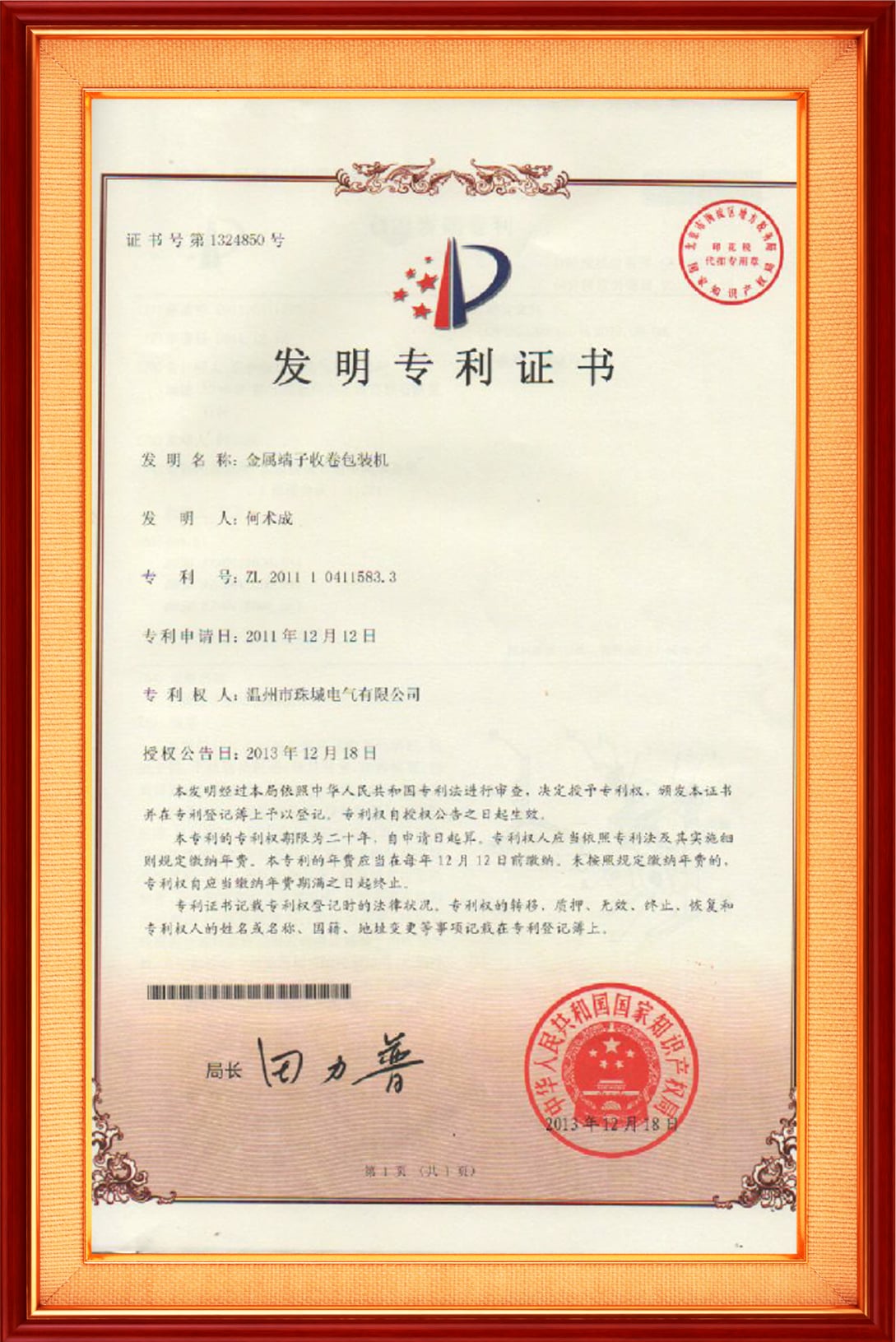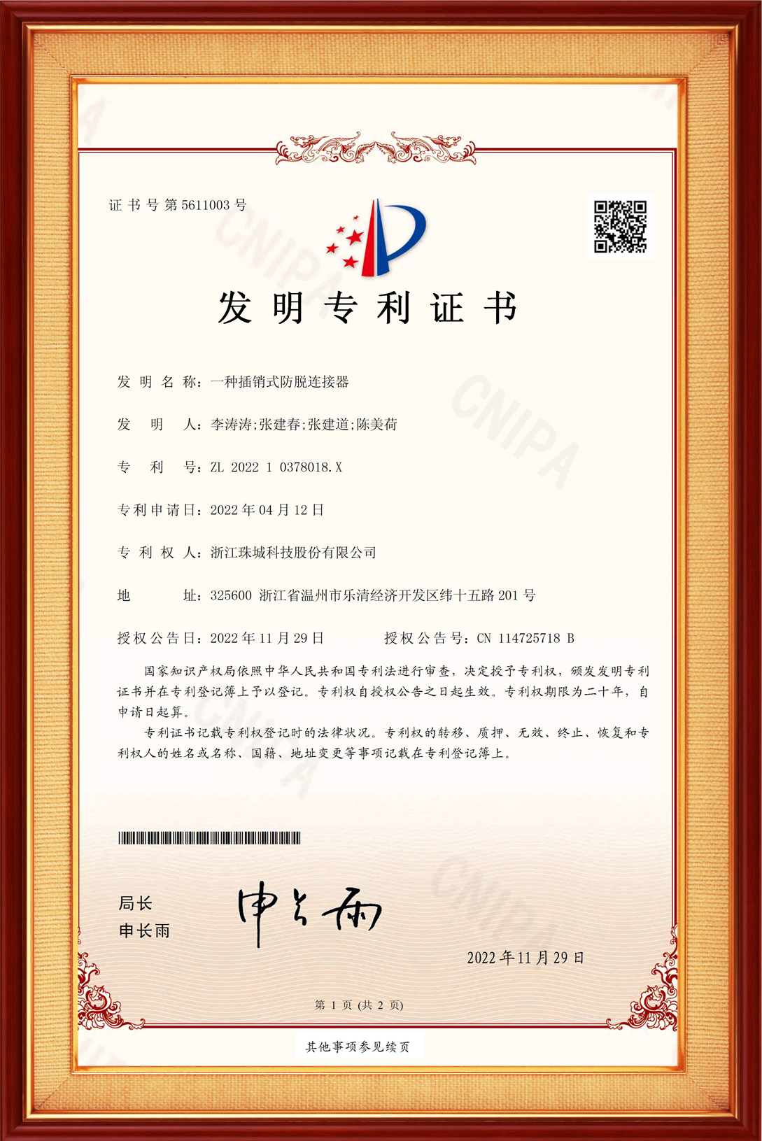 一種用于壓縮機(jī)玻璃柱的連接器發(fā)明專利證書(shū)